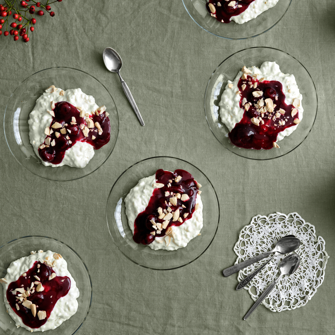 Til dessert serveres en klassisk risalamande med kirsebærsauce, tilsmagt med kardemomme og revet appelsinskal – en sød og cremet afslutning på julemiddagen.