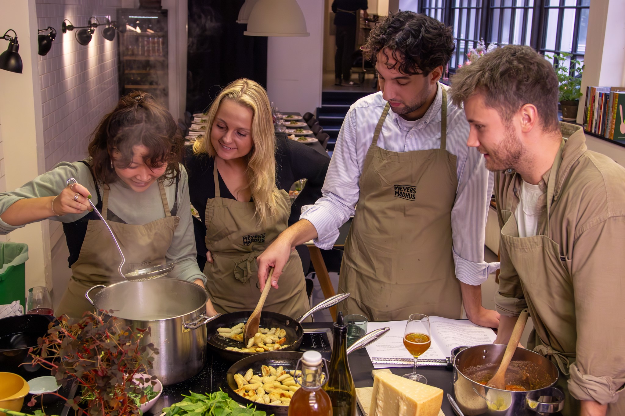 Meyers Madhus' dygtige kokke guider jer hele vejen, mens I i fællesskab laver et dejligt måltid, som I nyder med god vin, øl eller saft i glasset.