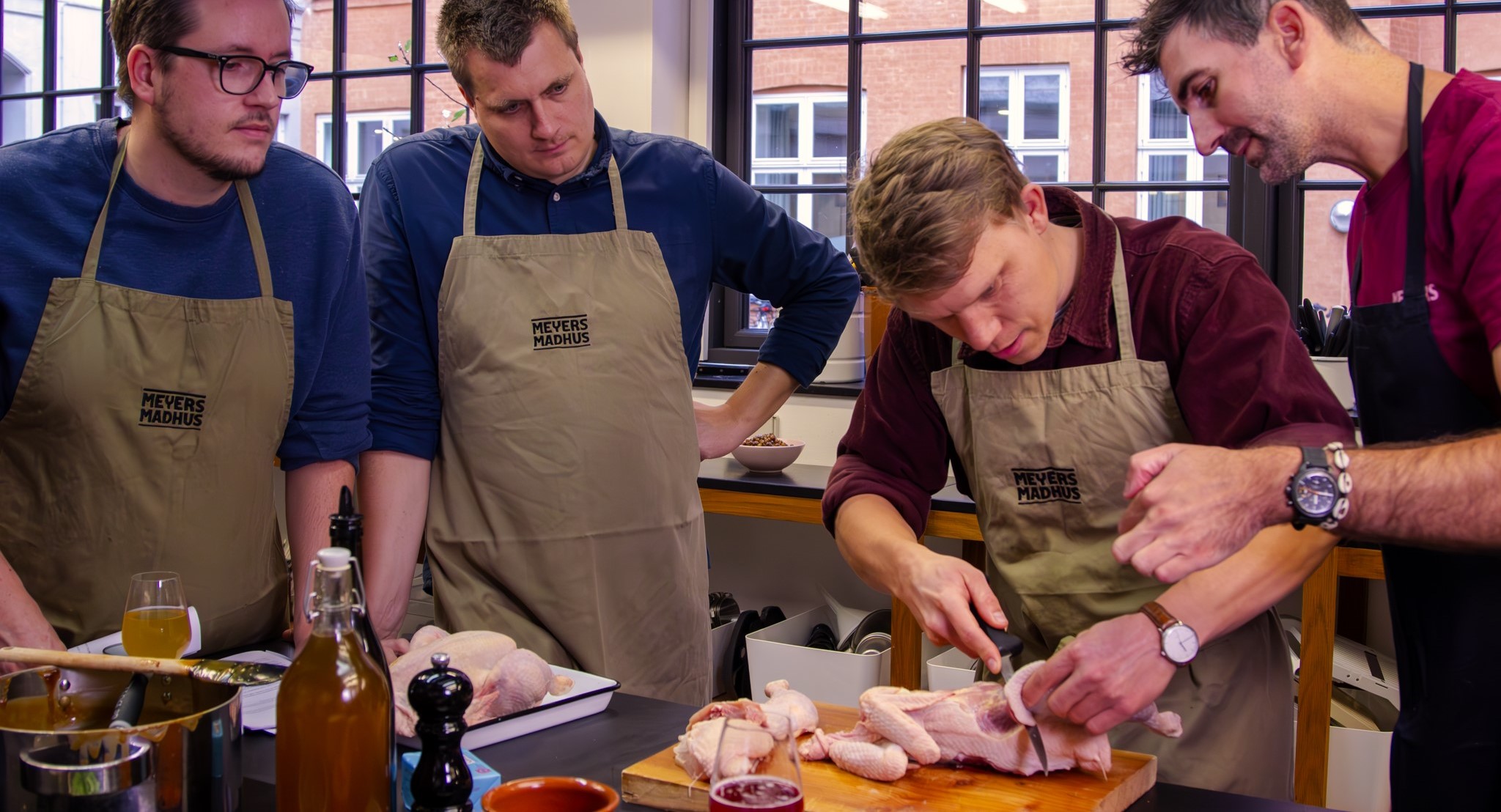 Vores dygtige kokke guider jer gennem dagen, og vores værter sørger for, at I ingenting mangler. Opvasken tager vi selvfølgelig også.