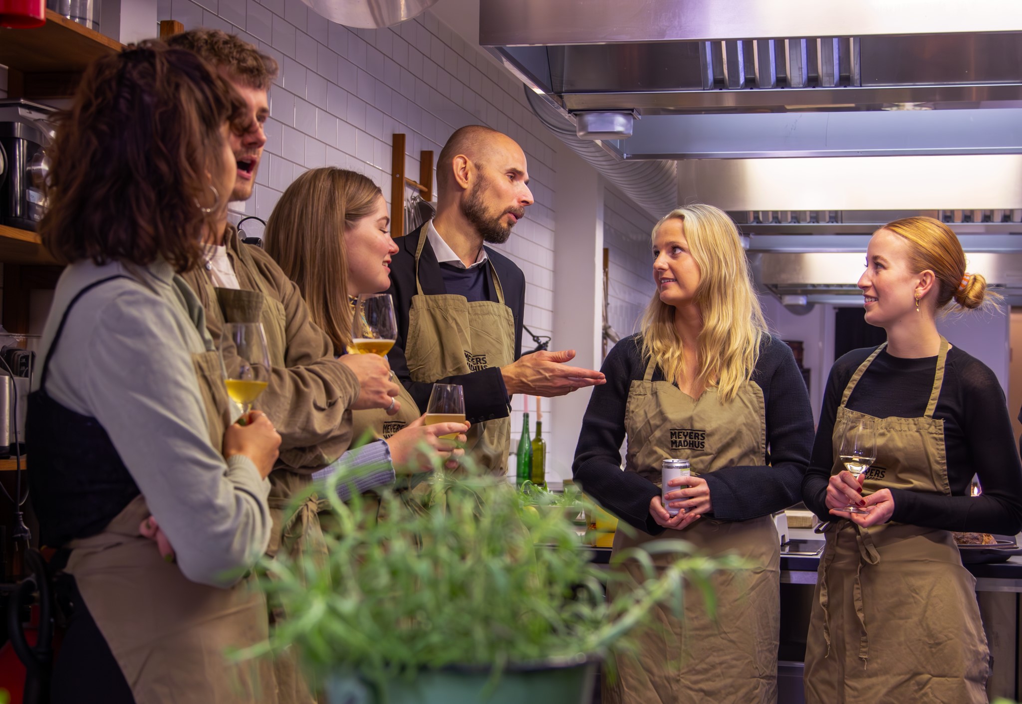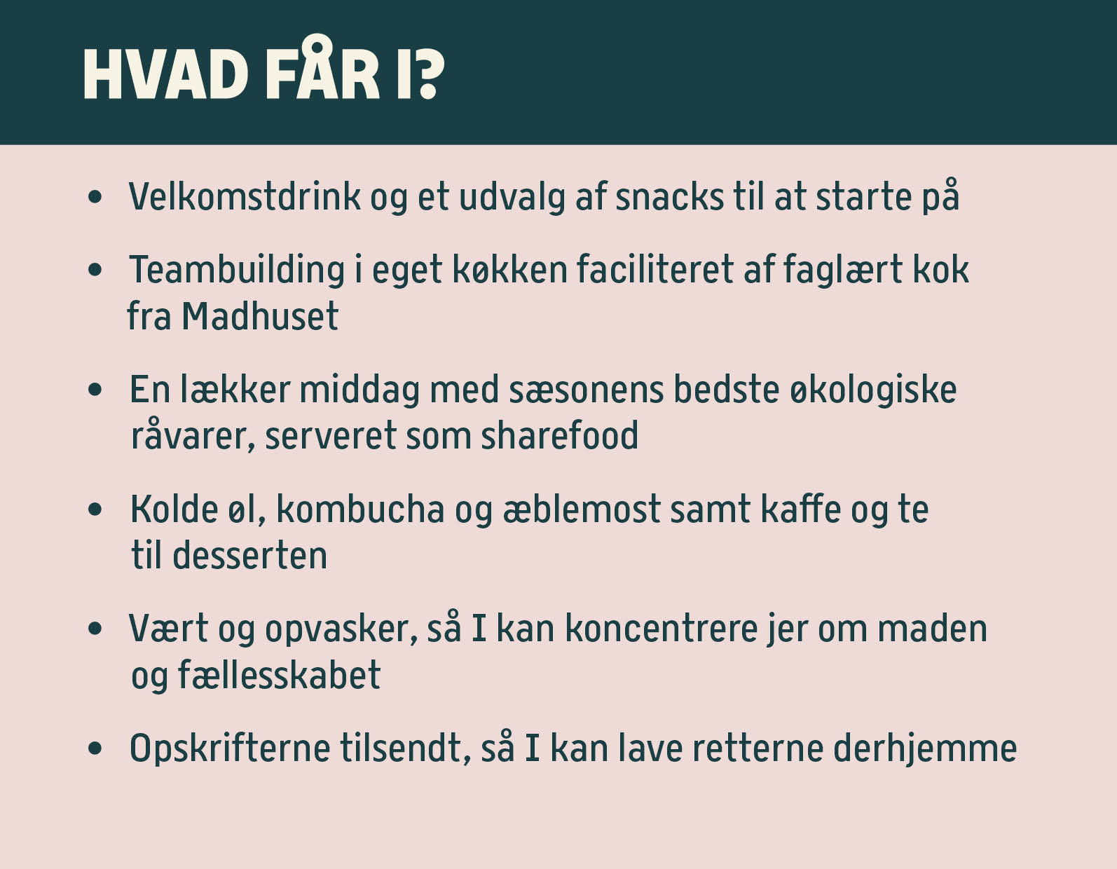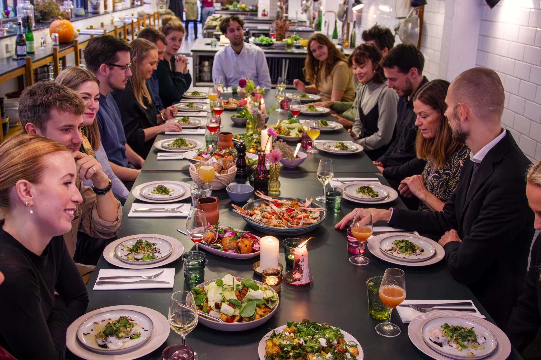I begynder med velkomstdrinks og snacks, hvor der er god tid til at nyde hinandens selskab efter en lang arbejdsdag. Senere trækker vi i forklæderne og går i køkkenet, hvor vores dygtige kokke guider jer igennem opskrifterne og sammen laver I en udsøgt middag, der bringes til det fælles bord og serveres som sharefood.