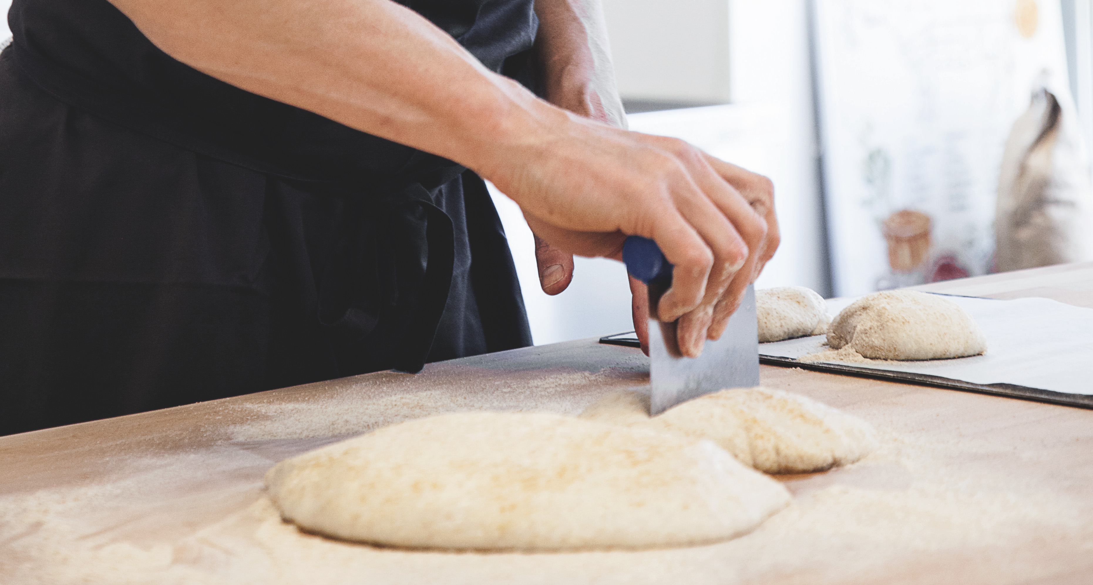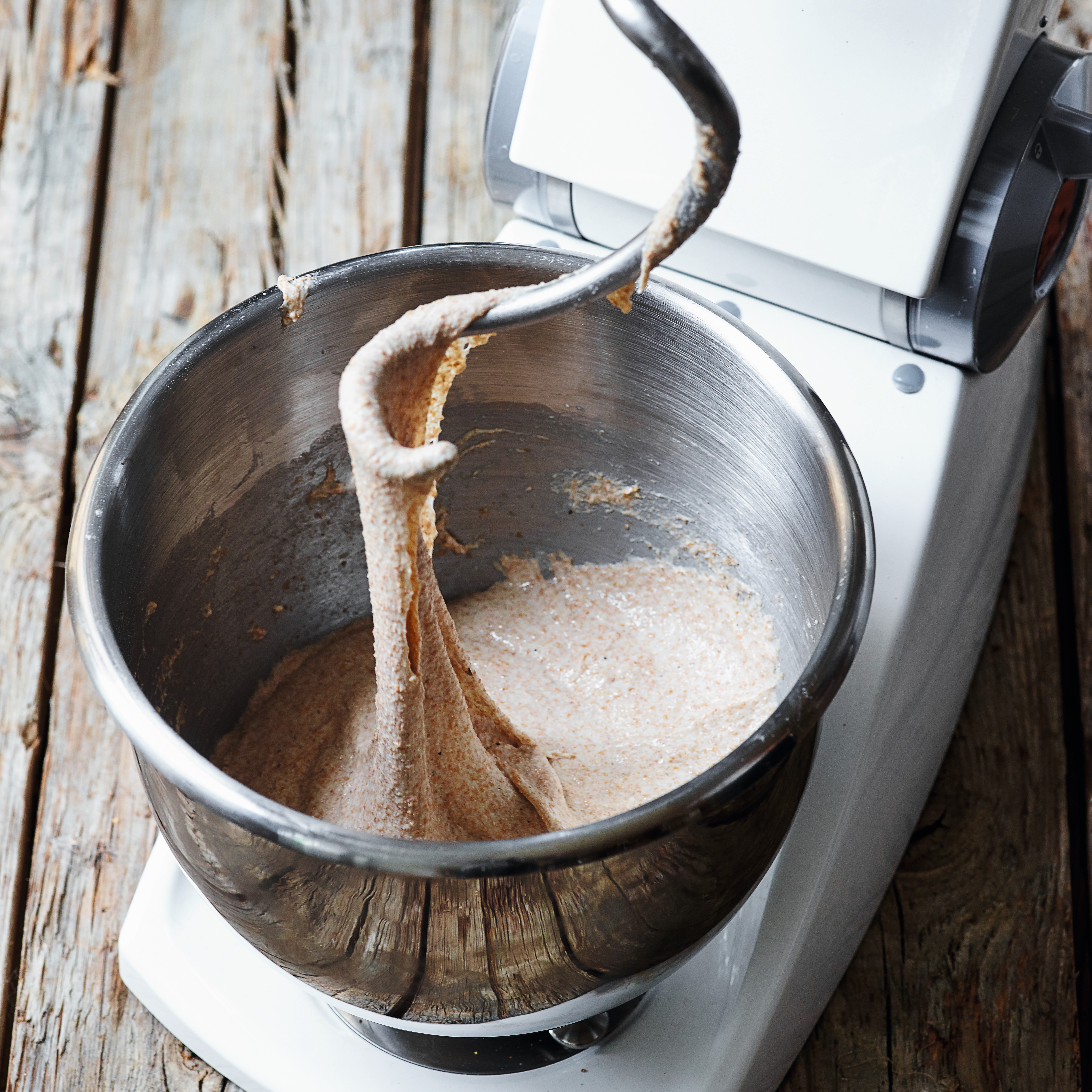 Du kan dog nemt rende ind i et par udfordringer, når du arbejder med deje med et relativt højt indhold af fuldkornsmel. Dels har fuldkornsmel et lavere glutenindhold end sigtet mel, og dels skærer de grove kim og skaldele glutennetværket i stykker. Derfor skal du gøre dig mere umage med æltning for at få en dej, der hæver ordentligt op.