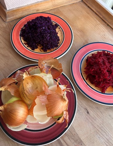 Selve farveintensiteten på de færdige æg afhænger både af, hvilke typer frugt og grønt man vælger, men også hvor længe æggene får lov at ligge i farvelagen. I vores udgave har vi brugt rødkål, rødbede og gule løgskaller, men det kan naturligvis varieres, lige som man har lyst.