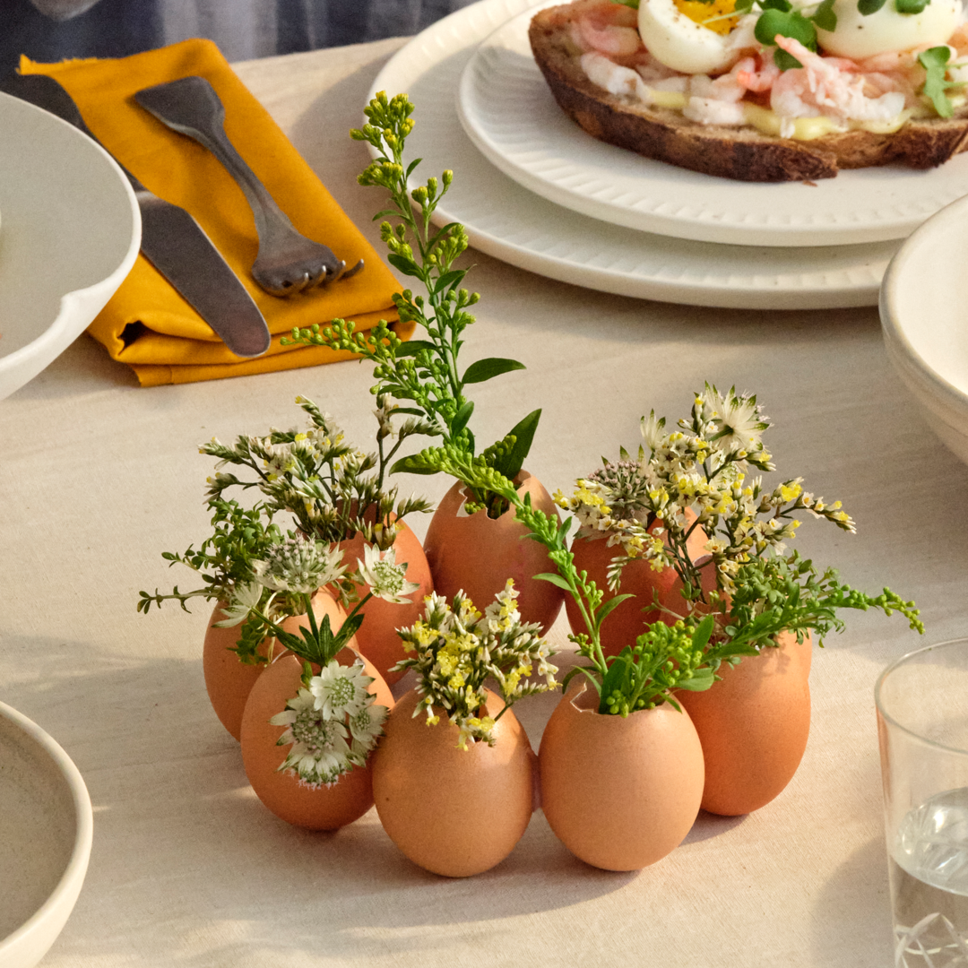 Æg kan bruges til meget mere end at være en del af menuen. Lav en smuk påskekrans af æg til at pryde dit frokostbord. Put f.eks. små, søde forårsblomster eller frisk karse i.