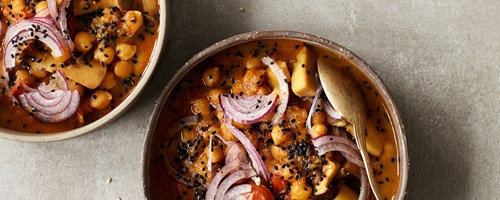 Den anden variant er vegetarisk: en varm og mættende gryderet med brune ærter og kartofler i stedet for kylling; til dem, der ønsker et plantebaseret alternativ uden at gå på kompromis med smagen.