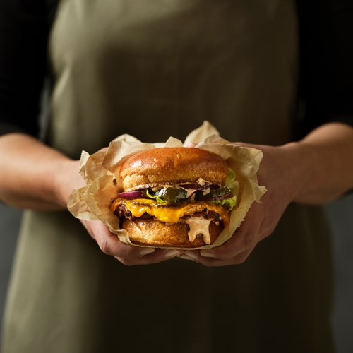 ”Ved at bage burgerbollen med en puré af hvide bønner får vi både en mere saftig bolle med mere substans, men bønnepuréen giver også et godt modspil til salt og sødme i smagsoplevelsen”, forklarer Christophe Miolane, som er gastronomisk udvikler hos Meyers og fortsætter:
