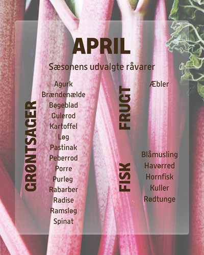 Kalenderen siger april, så nu er foråret for alvor i gang. I skovbunden er der dannet tæpper af både vintergæk og erantis. Mangler du en sjov og lærerig forårsaktivitet, kan du tage familien under armen på sanketur i det fri. Her kan du finde ramsløg, sødskærm og bøgeblade - bøgeblade, tænker du nok. Ja, du kan faktisk tidligt på sæsonen spise bøgeblade, for eksempel bruge dem i salater, hvor de giver en let syrlig smag. Du kan selvfølgelig også spise dem senere på sæsonen, men her bliver de lidt mere bitre i det, og der kan være gået flere insekter i bladet. Du kan se vores overblik over råvarerne i sæson nedenfor: