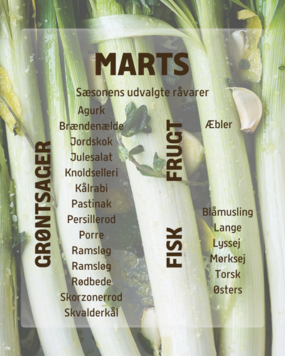 Du har nok allerede fået øje på de allerførste grønne skud, der pibler op af jorden, men forårsbebuderne tæller også muslinger og østers. Du kan se vores overblik over råvarerne i sæson nedenfor: