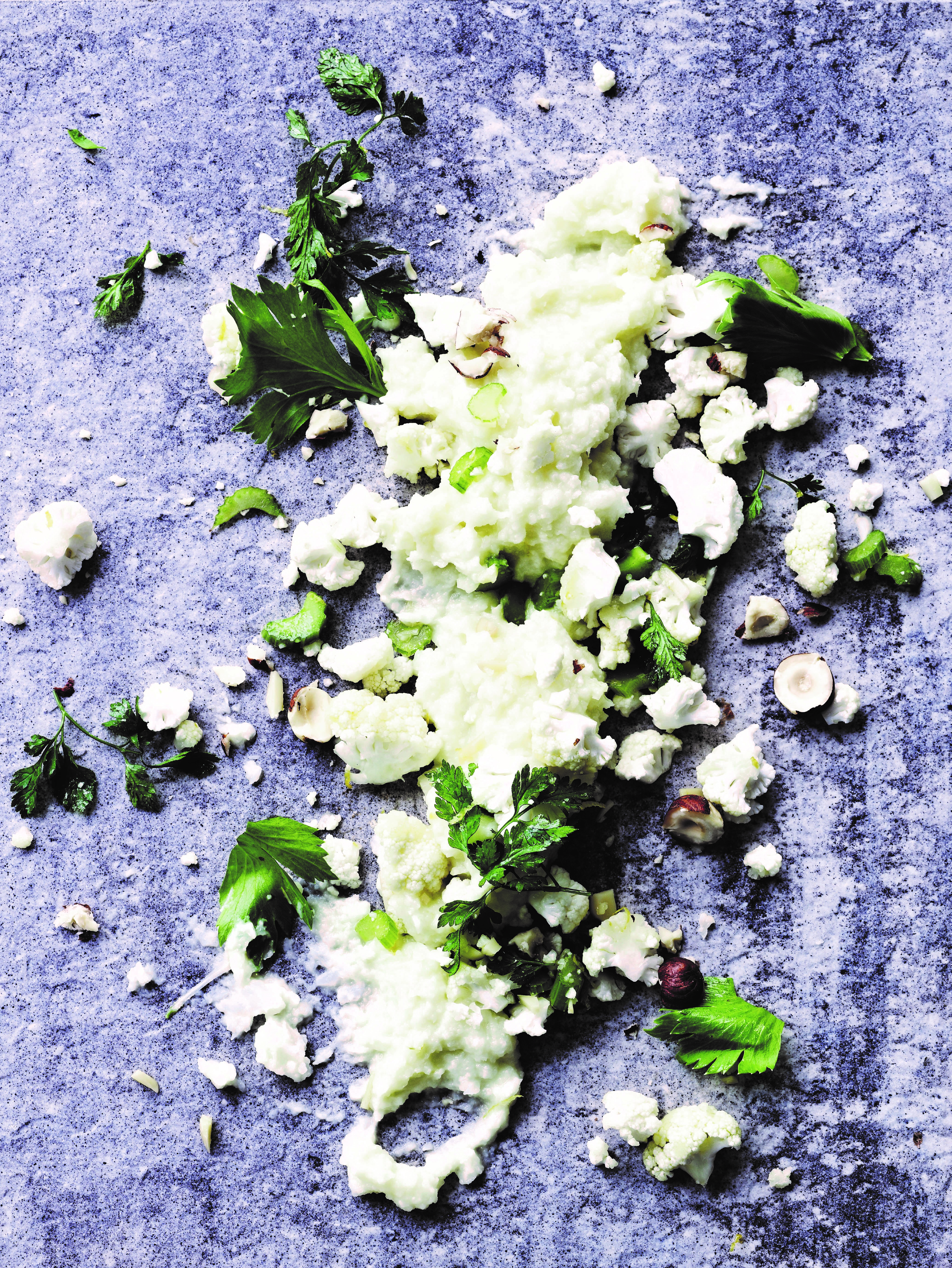 Blomkålspuré med sprød salat af blomkål hasselnød og bladselleri