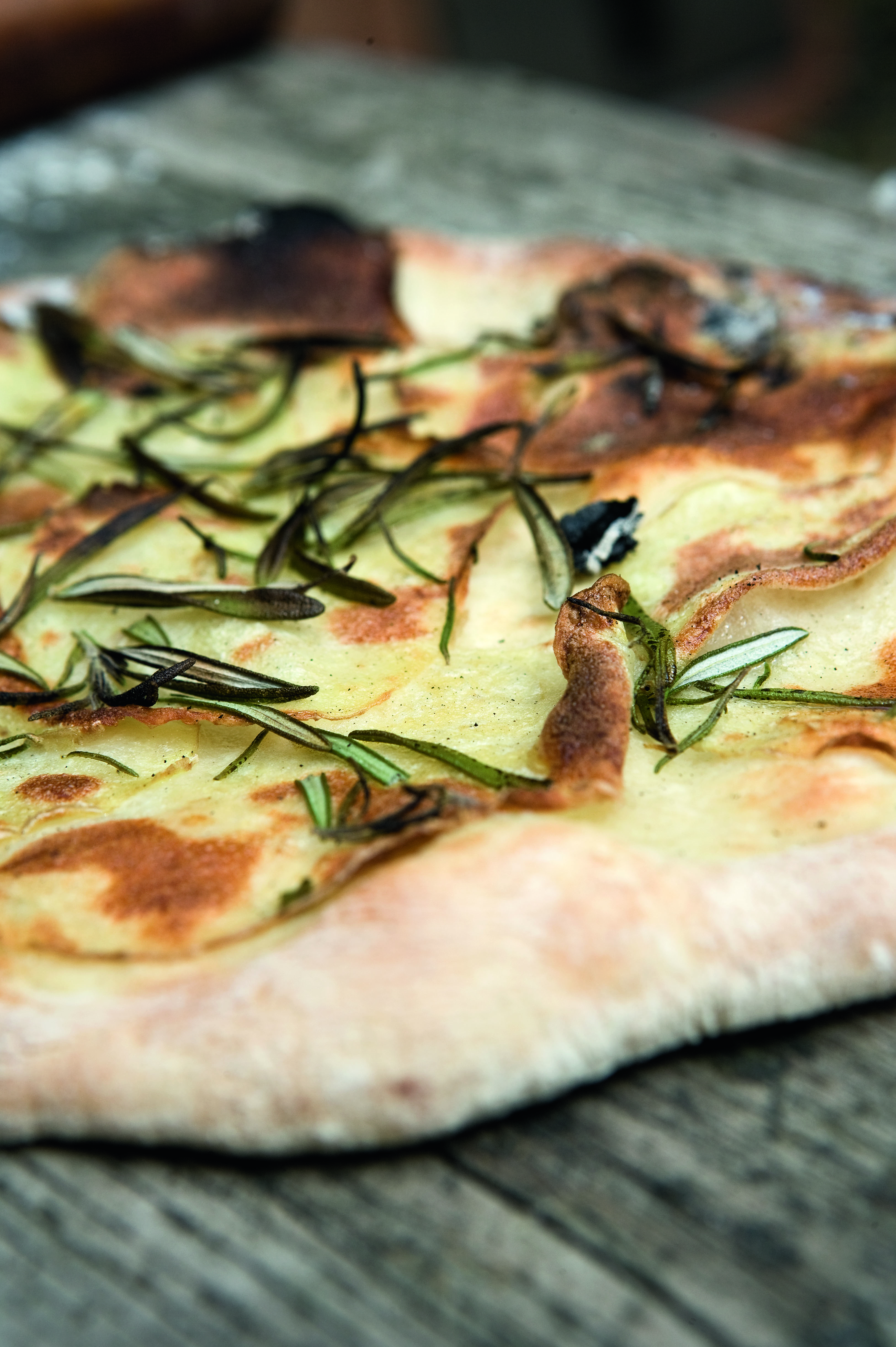 Skræl kartoflerne, skær dem så tyndt du overhovedet kan, og læg dem i koldt vand i 30 minutter for at fjerne noget at stivelsen. Lad kartoflerne dryppe af, vend dem så i olivenolie, og tilsæt rosmarinnåle men IKKE havsalt, der vil trække vandet ud af kartoflerne. Rul dejstykkerne helt tyndt ud på et melet bord, og træk dem herefter ned over bunden af en skål, der forinden er dækket af et melet klæde. Dejen skal være så tynd, at du næsten kan se igennem den. Læg et lag kartofler på hver pizzabund, og træk pizzaerne over på en melet brødspade efterhånden som de bliver klar. Sæt en bagesten i ovnen, og varm ovnen op til 250°. Bagpizzaerne en ad gangen på den brandvarme bagesten i 3–5 minutter – evt. lidt mere – og drys med havsalt, når de kommer ud. Server pizzaerne med det samme.