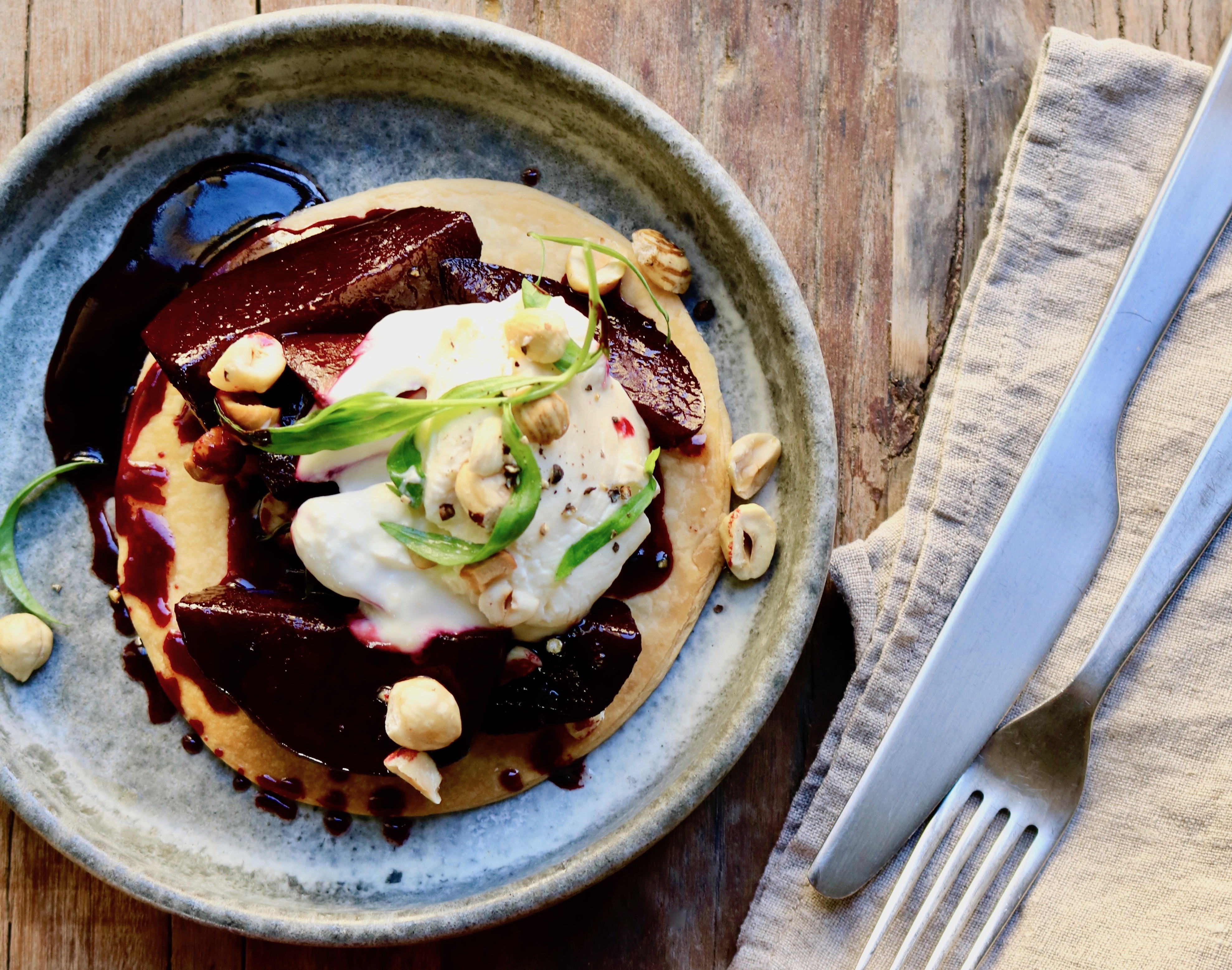 Butterdejstærte med sous vide rødbeder og rygeost