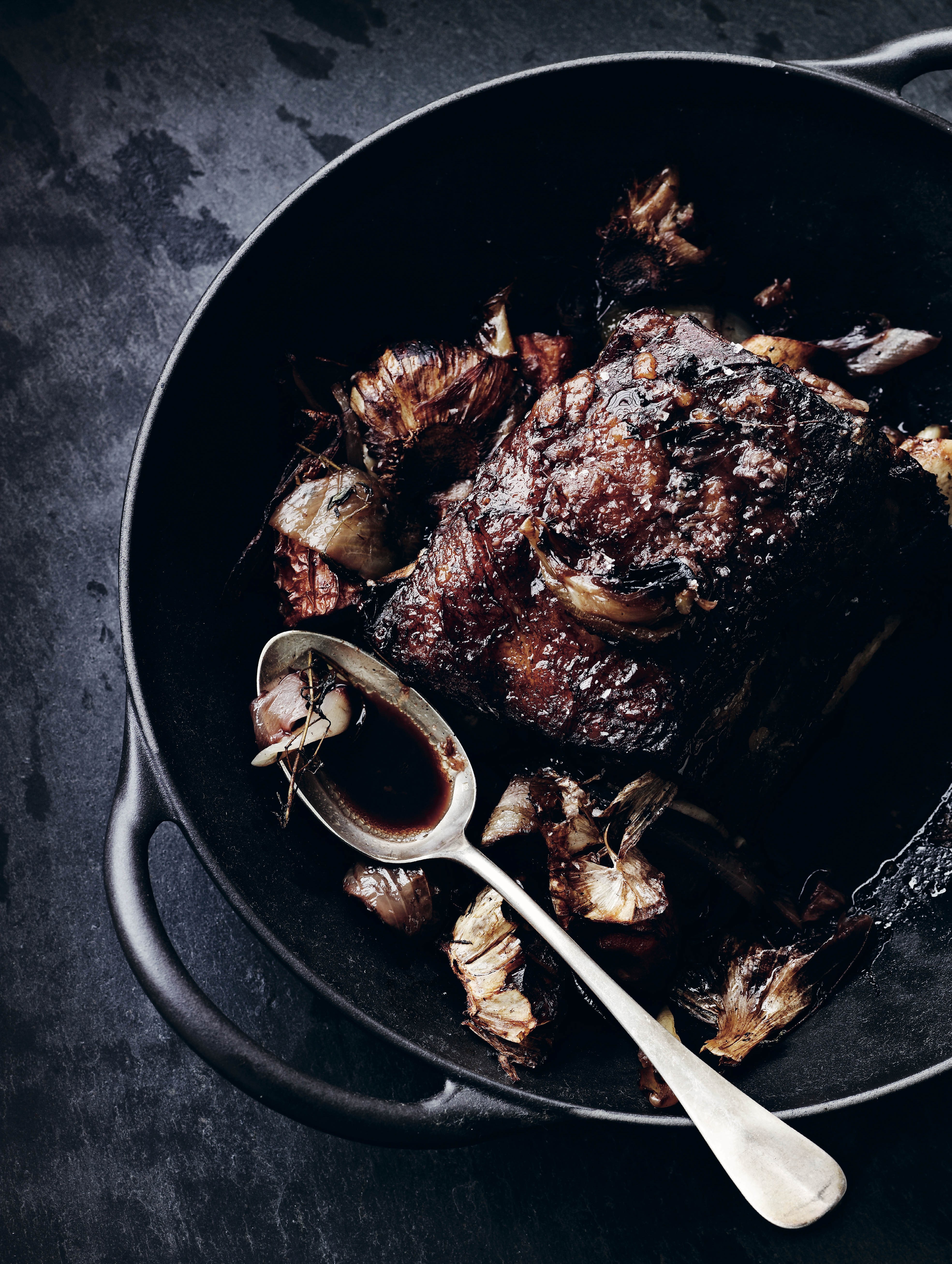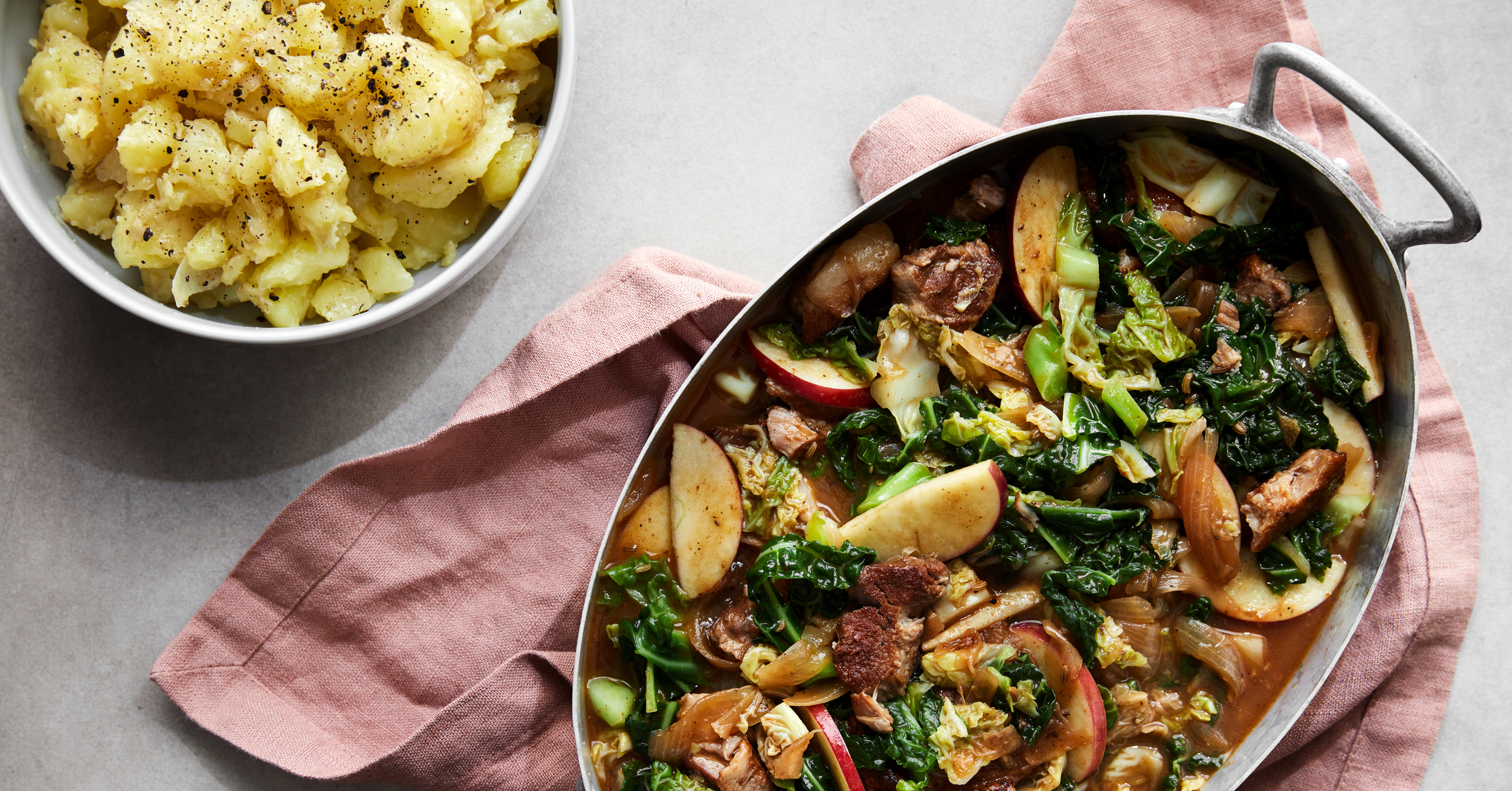 Gris simret i øl og æblemost med kål og grov kartoffelmos