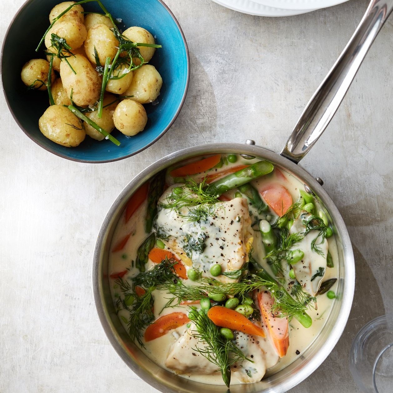 Kyllingefrikassé med asparges og edamamebønner