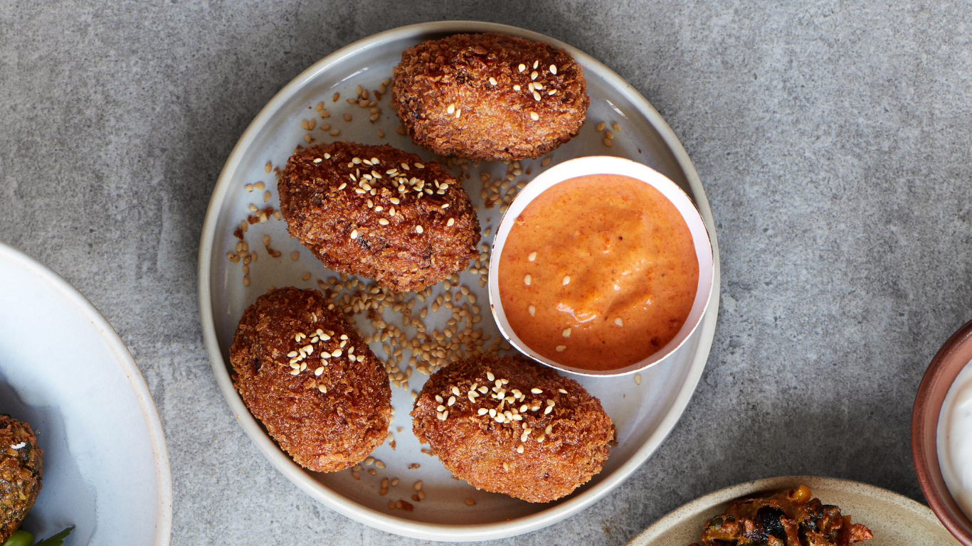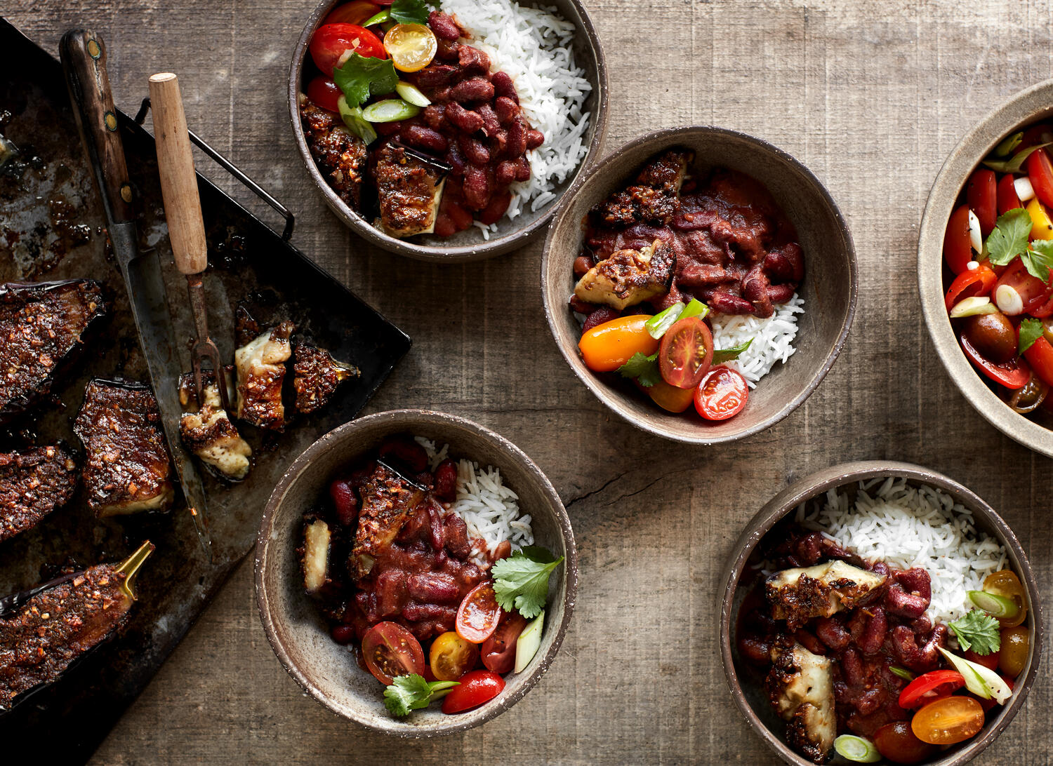 Ristede auberginer med bønne-tomatfyld, bagte løg, chili og basilikumpesto