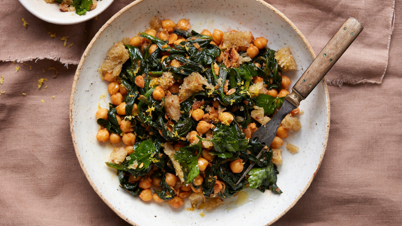 Gratineret siriusærtefars med spinat, ærter, spidskommen og oliven