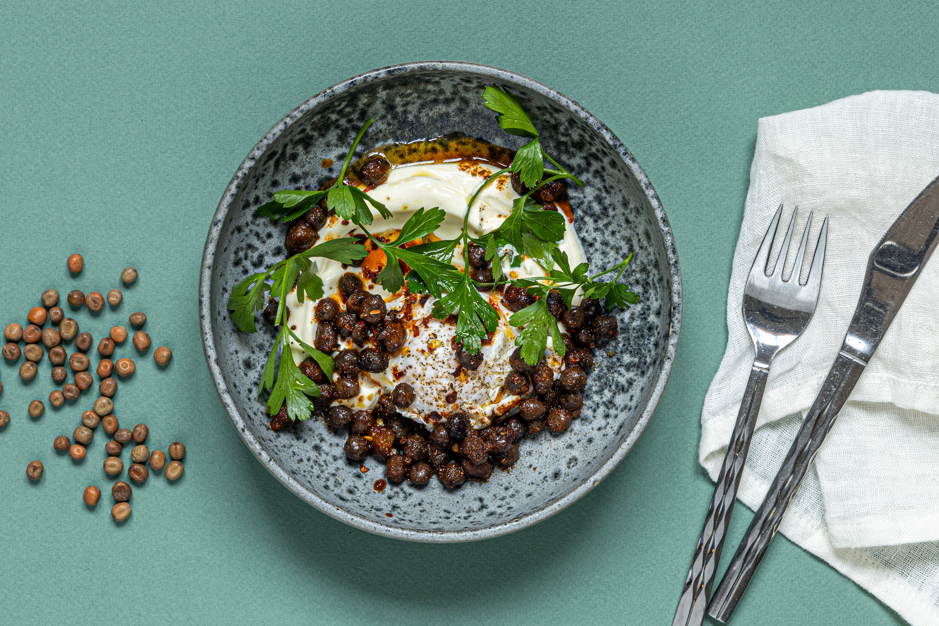 BLOMKÅLS-SIRIUSÆRTEGRATIN MED ÆRTEMASH OG PEBERROD