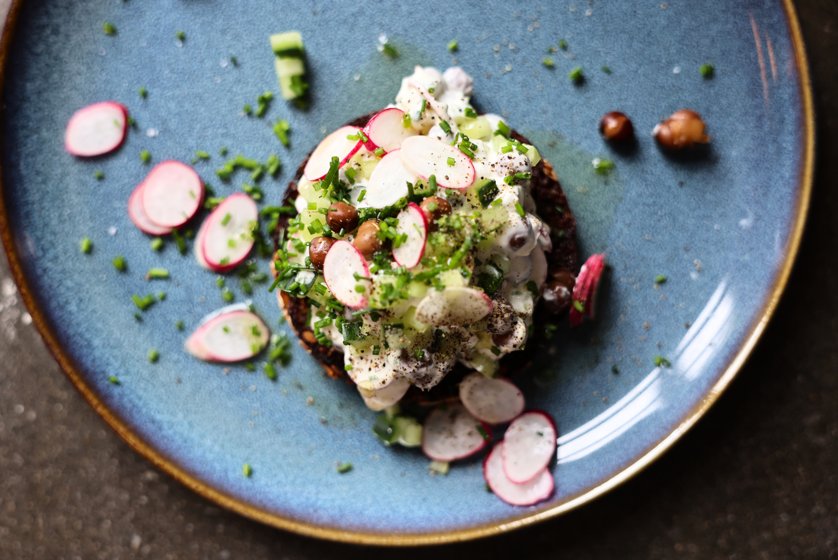 Nyfortolket cæsarsalat med gulärter, høbagt knoldselleri, grillet løg og ristede nødder